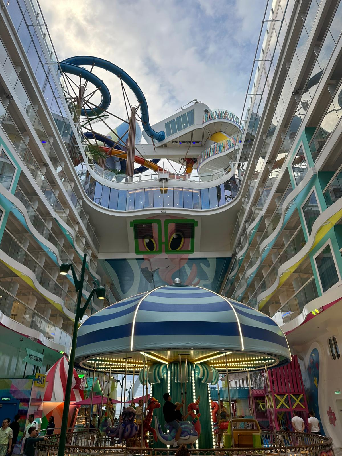 Serviciile super ok, iar daca iti plac activitatile in grup sunt multe zone de distractie. Nu te plictisesti. Vasul e imens, nu imi vine sa crezi cand te uiti la el. Multe zone de joaca si pentru copii. In schimb, greu cu sezlongurile la piscina. Greu as zice si cu locurile la masa, la orele principale erau full. Nu prindeam toti sa mancam la aceeasi masa. Cozi mari si in zonele de deserturi, dar merita asteptarea mereu.